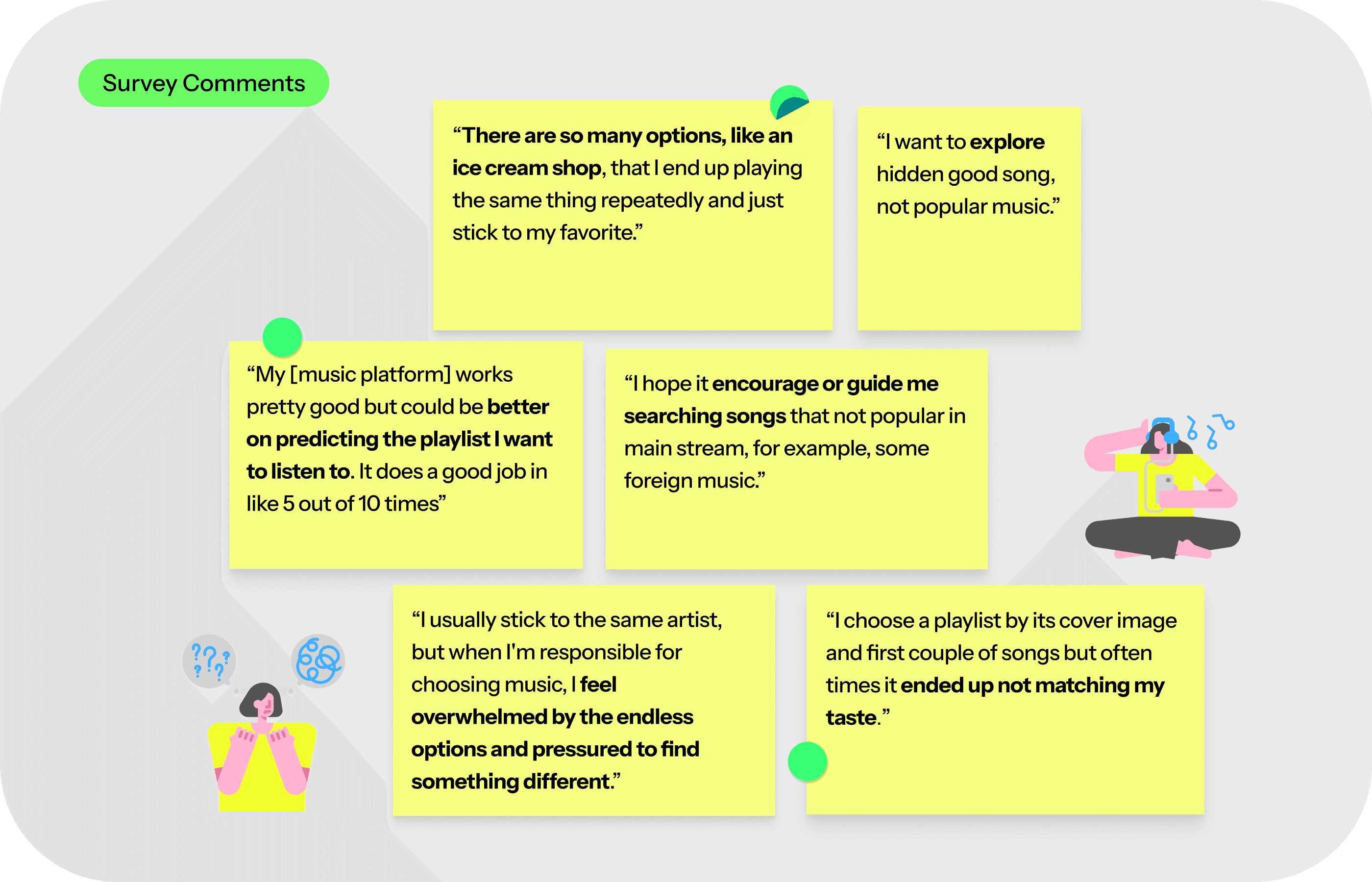 Just as music preferences differ, their experiences with music platforms also vary but all of the users wanted to choose matching playlist easily and intuitively. The survey and competitive analysis revealed the real challenge isn’t just finding any playlist, but it’s making the right choice at the right moment without stress.