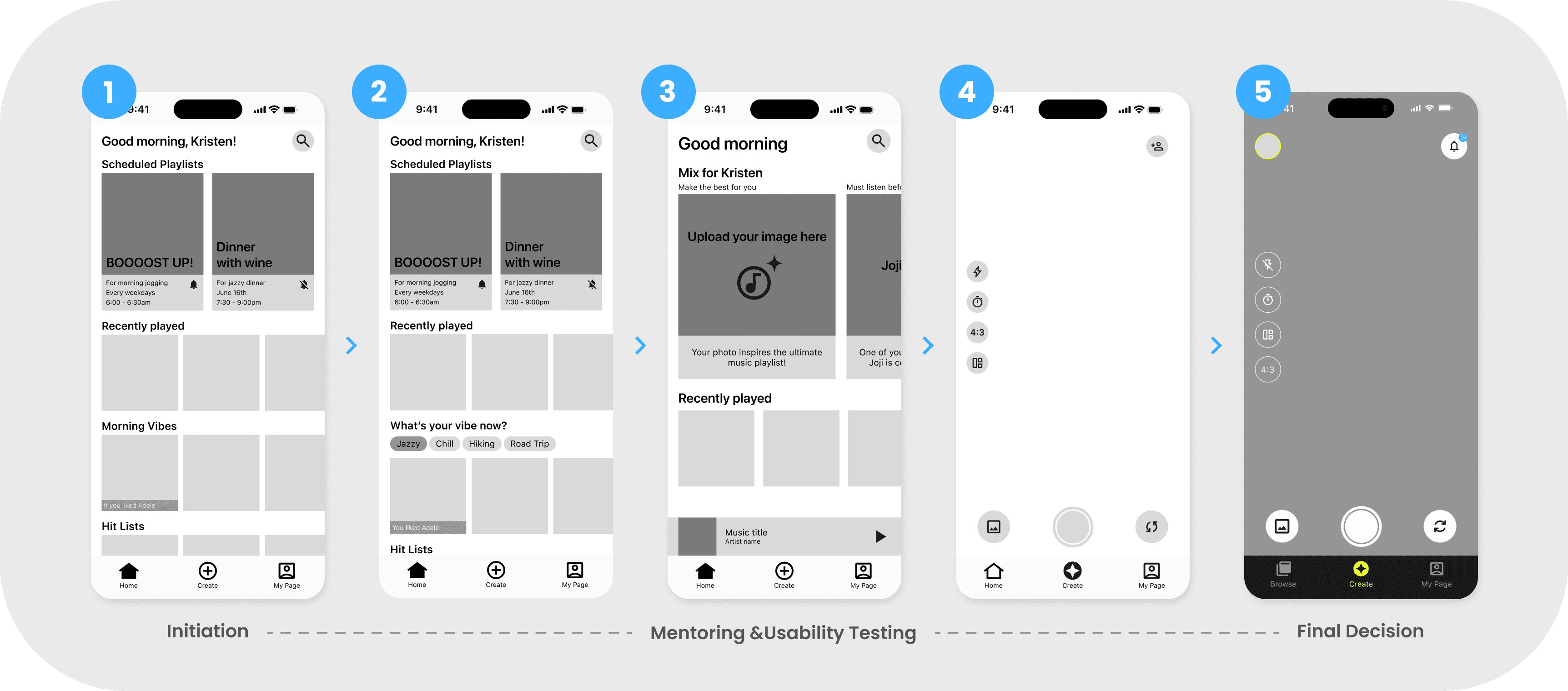 ● By replacing the 'Home' page with a 'Create' page, it curates users directly to the camera interface, emphasizing the app’s core feature of creating playlists from images.