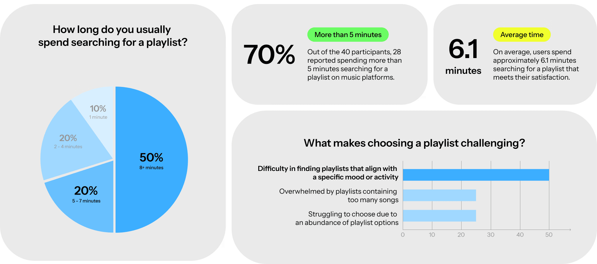 To hear from a broader range of users, I conducted a survey with 40 frequent music app users. The results revealed that many struggle when choosing a playlist, highlighting key pain points and opportunities to improve the overall music selection experience.